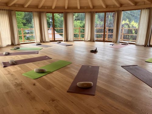Inmitten der Berge, mit Blick auf die Dolomitenregion üben wir in der neu gebauten Yogashala oder am Elemente Kraftplatz im Freien unsere Yogaeinheiten, Geh-und Sitzmeditationen, sowie die Atemschulung.